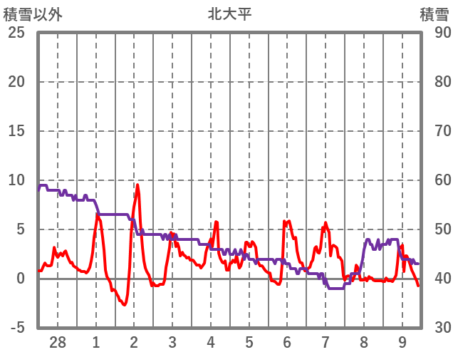 | 日 | 時 | 気温 | 降水 | 風向/風速 | 日照 | 積雪 | 降雪 |