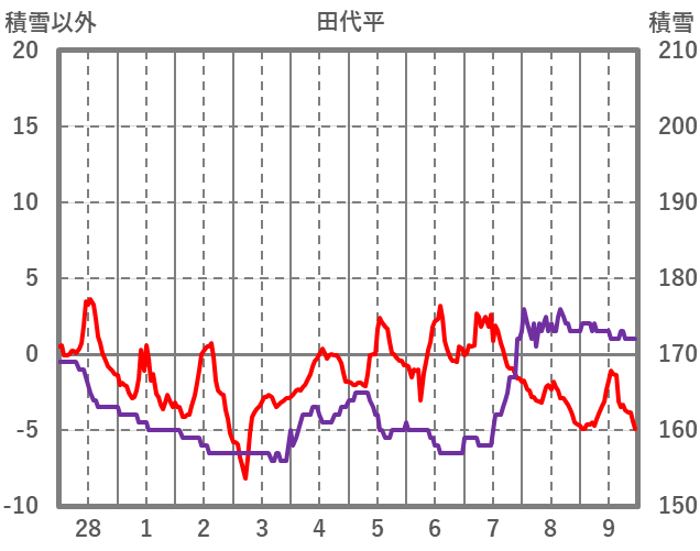 | 日 | 時 | 気温 | 降水 | 風向/風速 | 日照 | 積雪 | 降雪 |