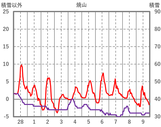 | 日 | 時 | 気温 | 降水 | 風向/風速 | 日照 | 積雪 | 降雪 |