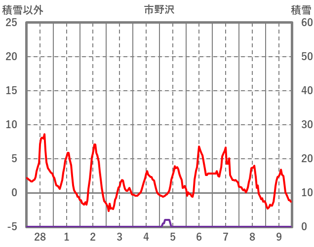 | 日 | 時 | 気温 | 降水 | 風向/風速 | 日照 | 積雪 | 降雪 |
