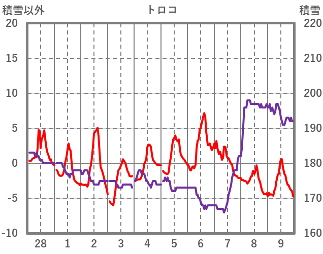 | 日 | 時 | 気温 | 降水 | 風向/風速 | 日照 | 積雪 | 降雪 |