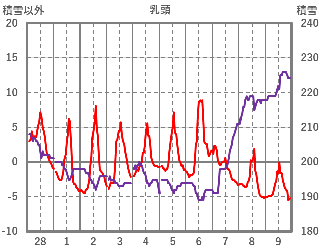 | 日 | 時 | 気温 | 降水 | 風向/風速 | 日照 | 積雪 | 降雪 |
