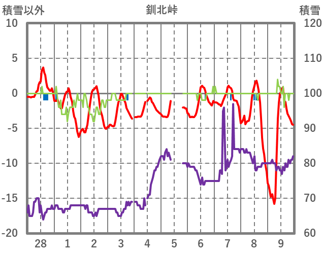 | 日 | 時 | 気温 | 降水 | 風向/風速 | 日照 | 積雪 | 降雪 |