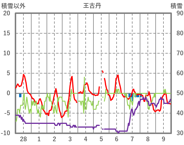 | 日 | 時 | 気温 | 降水 | 風向/風速 | 日照 | 積雪 | 降雪 |