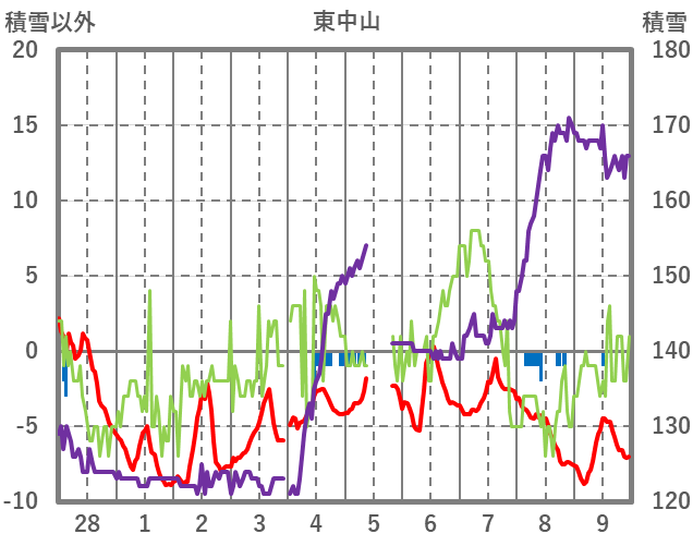 | 日 | 時 | 気温 | 降水 | 風向/風速 | 日照 | 積雪 | 降雪 |