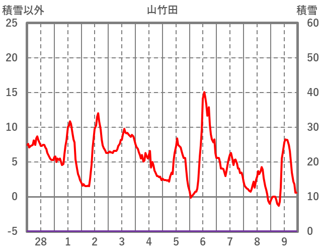 | 日 | 時 | 気温 | 降水 | 風向/風速 | 日照 | 積雪 | 降雪 |