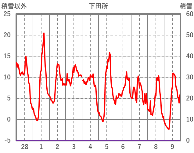 | 日 | 時 | 気温 | 降水 | 風向/風速 | 日照 | 積雪 | 降雪 |