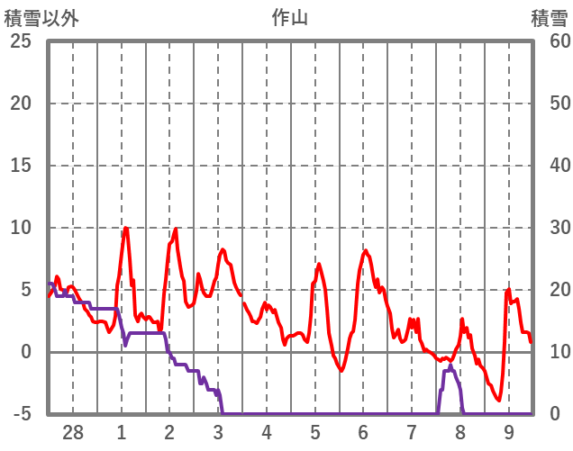 | 日 | 時 | 気温 | 降水 | 風向/風速 | 日照 | 積雪 | 降雪 |