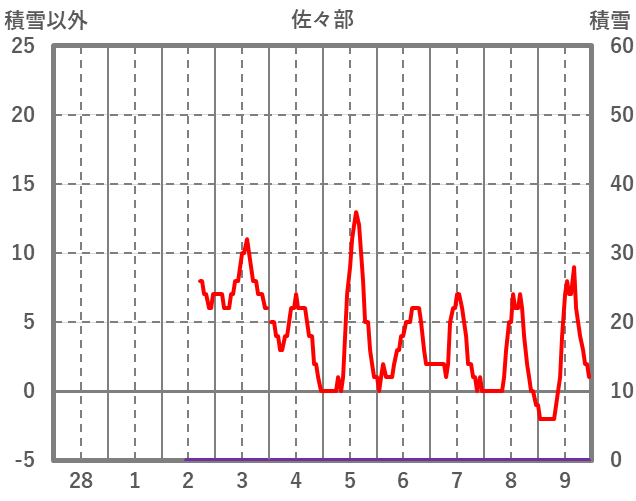 | 日 | 時 | 気温 | 降水 | 風向/風速 | 日照 | 積雪 | 降雪 |