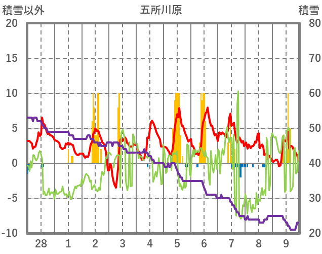 | 日 | 時 | 気温 | 降水 | 風向/風速 | 日照 | 積雪 | 降雪 |