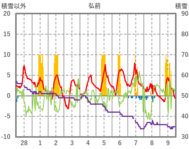 | 日 | 時 | 気温 | 降水 | 風向/風速 | 日照 | 積雪 | 降雪 |