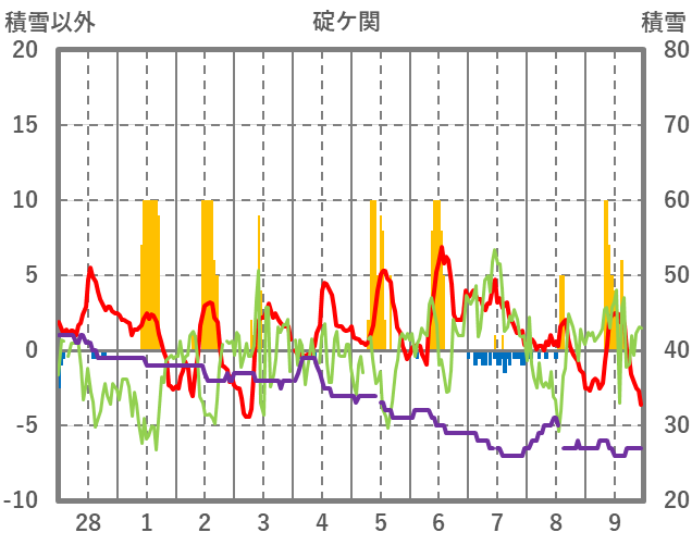| 日 | 時 | 気温 | 降水 | 風向/風速 | 日照 | 積雪 | 降雪 |
