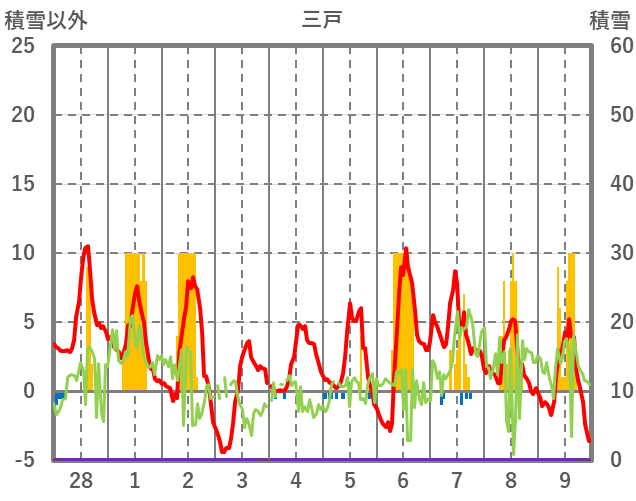 | 日 | 時 | 気温 | 降水 | 風向/風速 | 日照 | 積雪 | 降雪 |