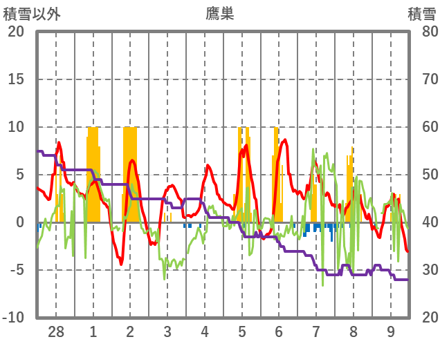 | 日 | 時 | 気温 | 降水 | 風向/風速 | 日照 | 積雪 | 降雪 |