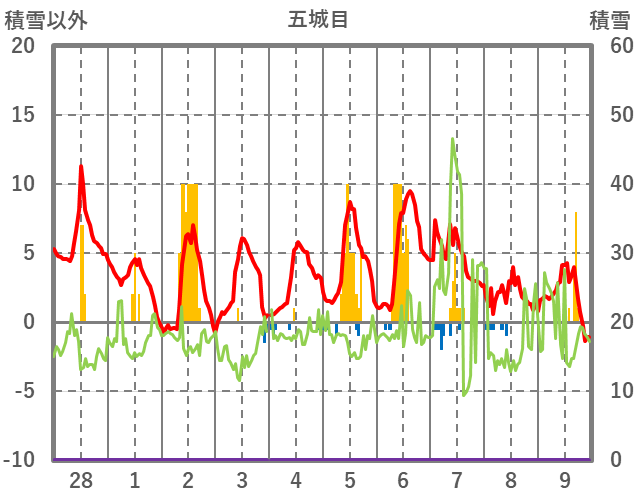 | 日 | 時 | 気温 | 降水 | 風向/風速 | 日照 | 積雪 | 降雪 |