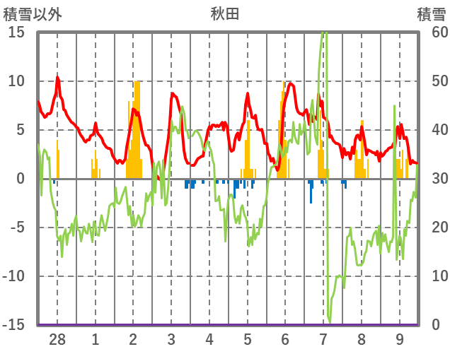 | 日 | 時 | 気温 | 降水 | 風向/風速 | 日照 | 積雪 | 降雪 |