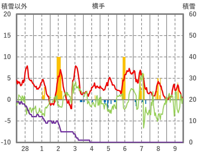 | 日 | 時 | 気温 | 降水 | 風向/風速 | 日照 | 積雪 | 降雪 |
