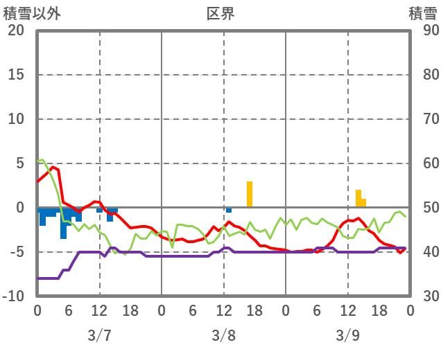 | 日 | 時 | 気温 | 降水 | 風向/風速 | 日照 | 積雪 | 降雪 |