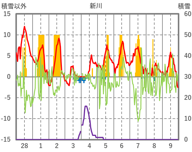 | 日 | 時 | 気温 | 降水 | 風向/風速 | 日照 | 積雪 | 降雪 |