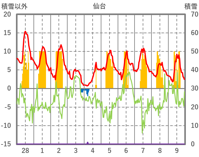 | 日 | 時 | 気温 | 降水 | 風向/風速 | 日照 | 積雪 | 降雪 |