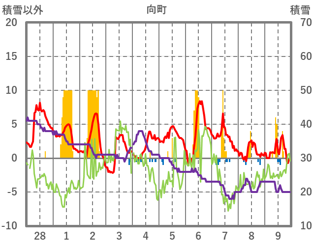 | 日 | 時 | 気温 | 降水 | 風向/風速 | 日照 | 積雪 | 降雪 |