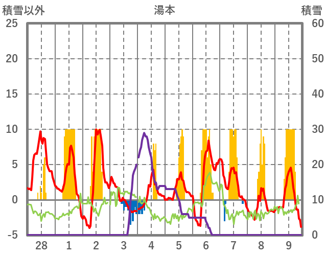 | 日 | 時 | 気温 | 降水 | 風向/風速 | 日照 | 積雪 | 降雪 |