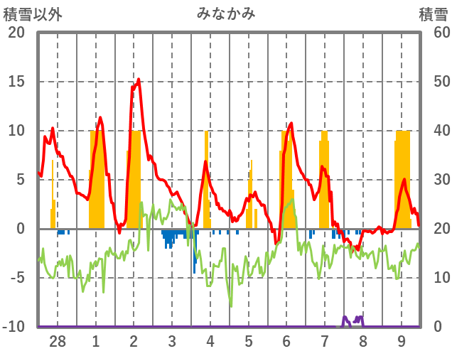 | 日 | 時 | 気温 | 降水 | 風向/風速 | 日照 | 積雪 | 降雪 |