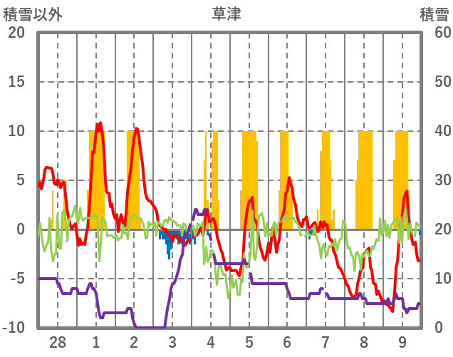 | 日 | 時 | 気温 | 降水 | 風向/風速 | 日照 | 積雪 | 降雪 |