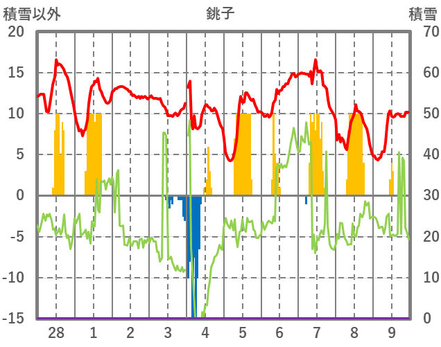 | 日 | 時 | 気温 | 降水 | 風向/風速 | 日照 | 積雪 | 降雪 |