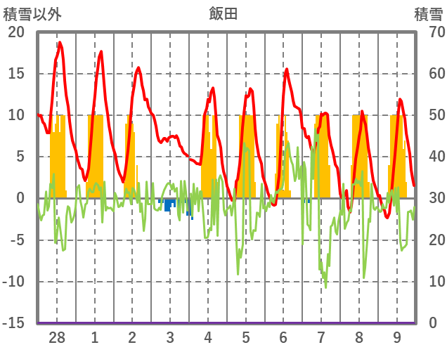 | 日 | 時 | 気温 | 降水 | 風向/風速 | 日照 | 積雪 | 降雪 |