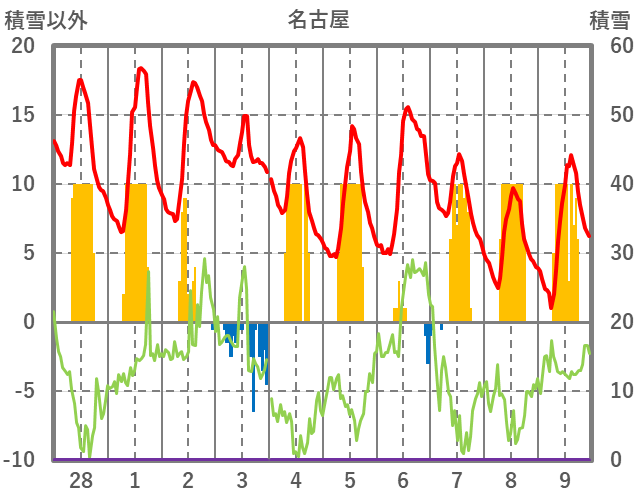 | 日 | 時 | 気温 | 降水 | 風向/風速 | 日照 | 積雪 | 降雪 |