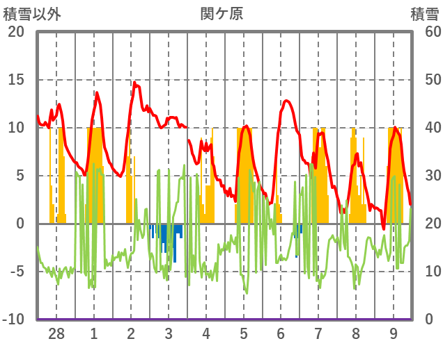 | 日 | 時 | 気温 | 降水 | 風向/風速 | 日照 | 積雪 | 降雪 |