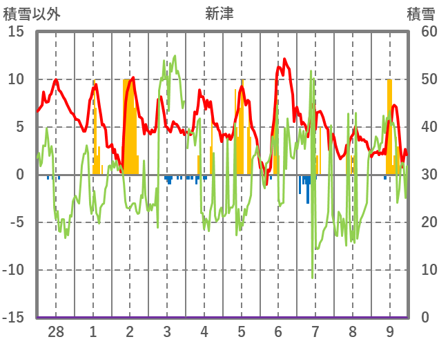| 日 | 時 | 気温 | 降水 | 風向/風速 | 日照 | 積雪 | 降雪 |