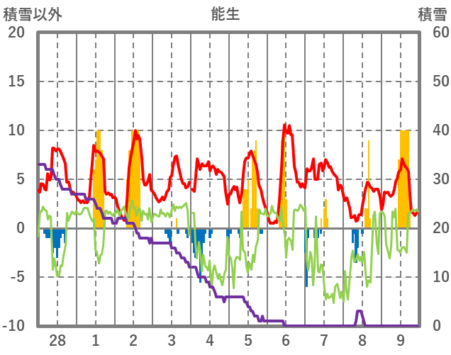 | 日 | 時 | 気温 | 降水 | 風向/風速 | 日照 | 積雪 | 降雪 |