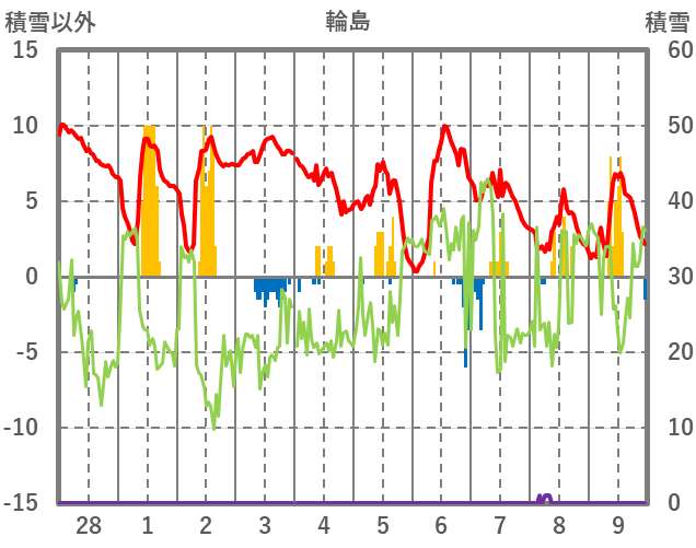 | 日 | 時 | 気温 | 降水 | 風向/風速 | 日照 | 積雪 | 降雪 |
