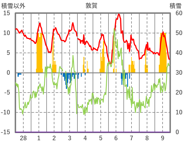 | 日 | 時 | 気温 | 降水 | 風向/風速 | 日照 | 積雪 | 降雪 |