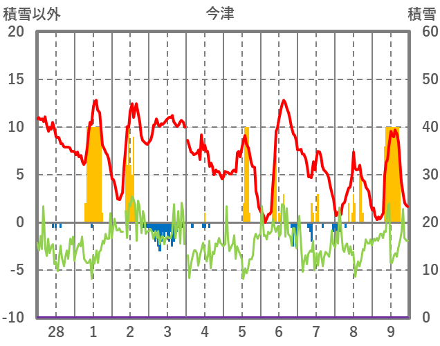 | 日 | 時 | 気温 | 降水 | 風向/風速 | 日照 | 積雪 | 降雪 |