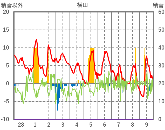 | 日 | 時 | 気温 | 降水 | 風向/風速 | 日照 | 積雪 | 降雪 |