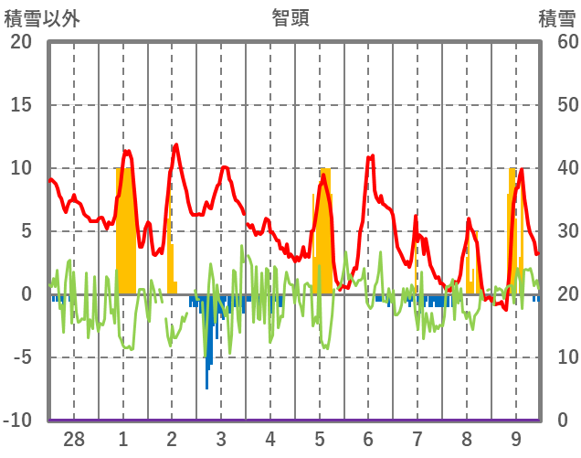 | 日 | 時 | 気温 | 降水 | 風向/風速 | 日照 | 積雪 | 降雪 |