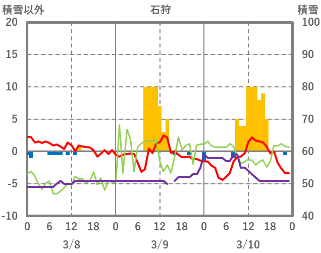 | 日 | 時 | 気温 | 降水 | 風向/風速 | 日照 | 積雪 | 降雪 |