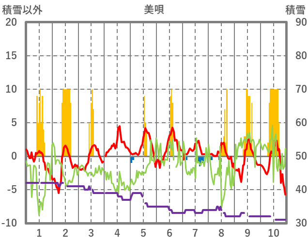 | 日 | 時 | 気温 | 降水 | 風向/風速 | 日照 | 積雪 | 降雪 |