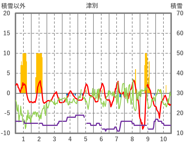 | 日 | 時 | 気温 | 降水 | 風向/風速 | 日照 | 積雪 | 降雪 |