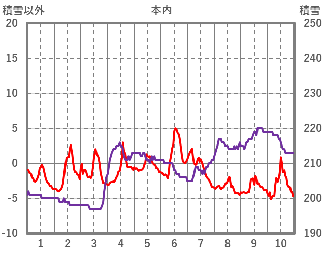 | 日 | 時 | 気温 | 降水 | 風向/風速 | 日照 | 積雪 | 降雪 |