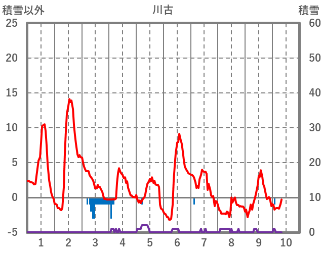 | 日 | 時 | 気温 | 降水 | 風向/風速 | 日照 | 積雪 | 降雪 |