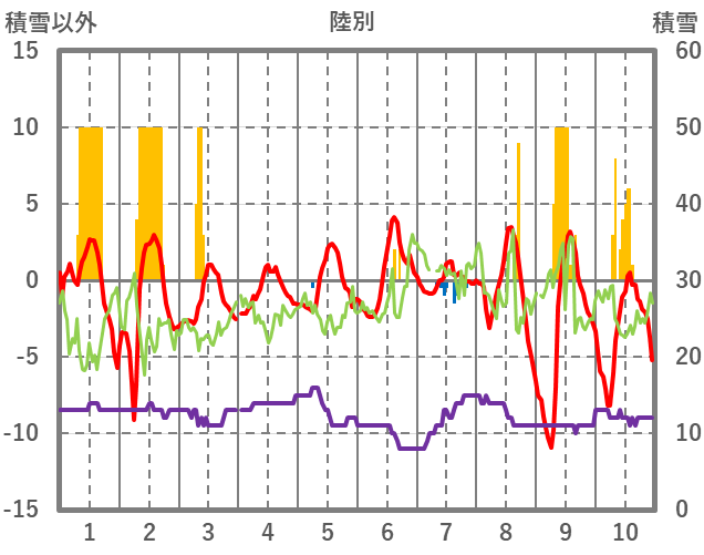 | 日 | 時 | 気温 | 降水 | 風向/風速 | 日照 | 積雪 | 降雪 |