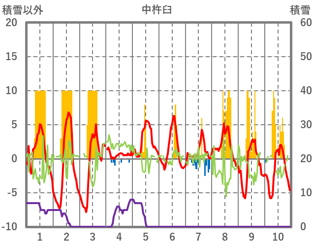 | 日 | 時 | 気温 | 降水 | 風向/風速 | 日照 | 積雪 | 降雪 |