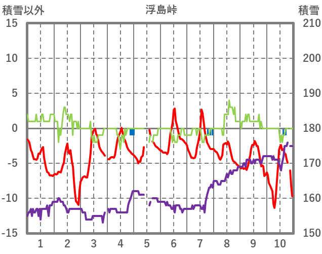 | 日 | 時 | 気温 | 降水 | 風向/風速 | 日照 | 積雪 | 降雪 |