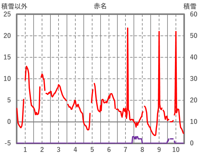| 日 | 時 | 気温 | 降水 | 風向/風速 | 日照 | 積雪 | 降雪 |