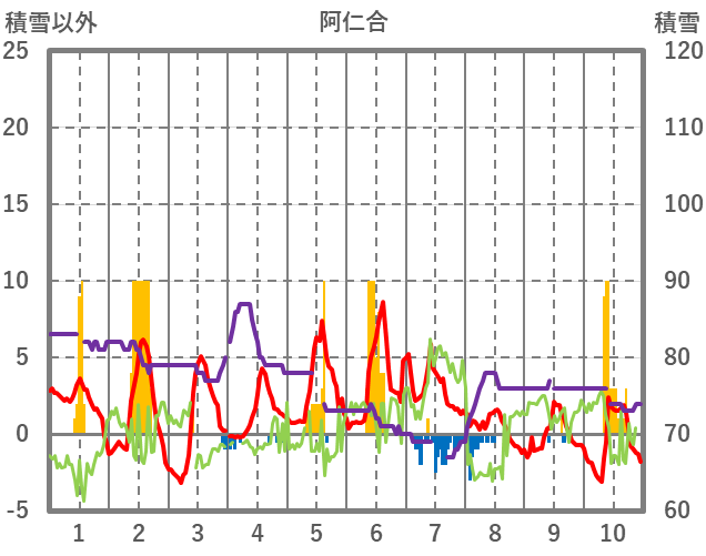 | 日 | 時 | 気温 | 降水 | 風向/風速 | 日照 | 積雪 | 降雪 |