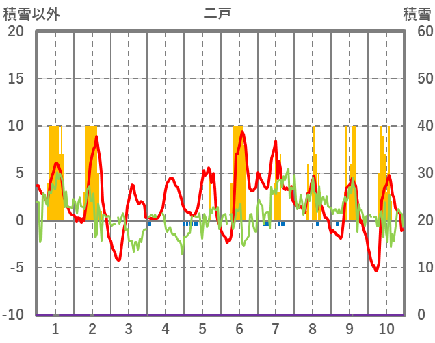 | 日 | 時 | 気温 | 降水 | 風向/風速 | 日照 | 積雪 | 降雪 |